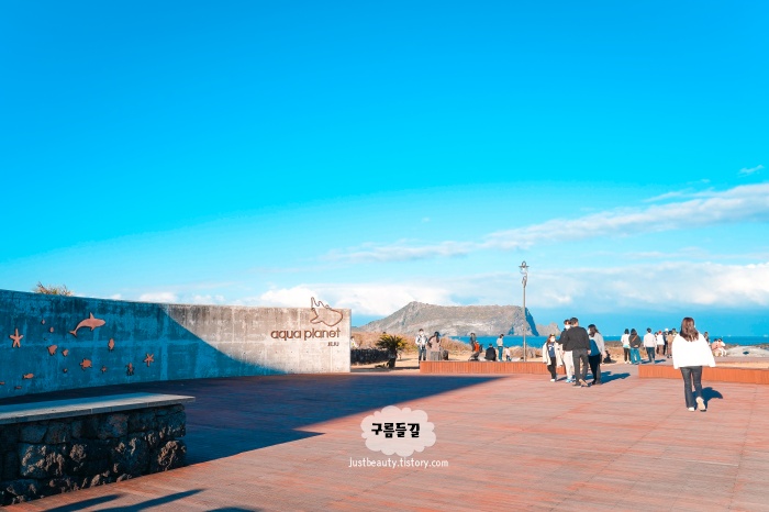 밖으로 나와서 산책도 가능합니다. 성산일출봉이 아주 가깝고도 선명하게 보입니다. 바람은 차가운 날이었지만 미세먼지 없이 정말 예쁜 날이었습니다. 처음에 제주 아쿠아플라넷을 방문했을 때는 너무 재미있어서 어른들끼리 왔음에도 5시간 이상을 머물렀었는데도 그 이후에는 점차 머무는 시간이 줄어들면어 이번에는 2시간 30분 ~ 3시간 사이를 머물렀던 것 같습니다. 하지만 마찬가지로 이번에도 입장료가 아깝지는 않았고, 또 지인분들이 제주도 가족여행을 온다면 추천해줄 장소입니다. 산책하기 좋은 곳도 있구요. 갑자기 너무 춥고, 너무 덥고, 바람이 불고, 비가 내려 제주도 여행코스가 고민될 때는 제주 아쿠아플라넷에서 좋은 시간을 가져보시기 바랍니다.
