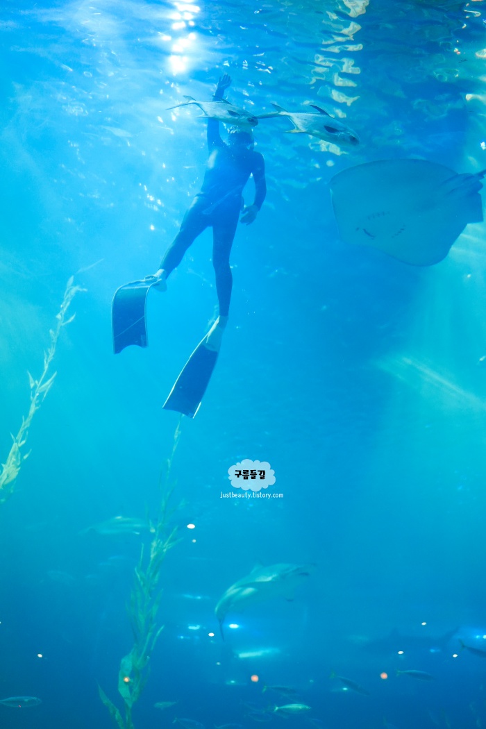 단일 수조로는 세계 최대급을 보유하고 있는 곳이 제주 아쿠아 플라넷입니다. 코로나가 터지기 전에 일본 오키나와 여행을 갔었는데 거기 수조도 상당히 컸었는데 이곳이 더 크다고 하더라구요. 올때마다 늘 감동으로 다가오는 장소입니다. 볼거리가 늘 많고, 규모도 크고, 공연도 늘 재미있습니다.