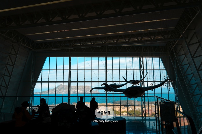 주차장은 넉넉하고 주차 도와주시는 분은 있을 때도 있고 안 계실 때도 있고 그렇더라구요. 아무튼 올 때마다 주차공간이 부족해서 짜증났던 적은 한 번도 없었습니다. 또한 아쿠아플라넷 안으로 들어오면 보이는 성산일출봉 이 풍경은 언제나 아름답습니다. 참 좋은 위치에 자리를 잡았죠.