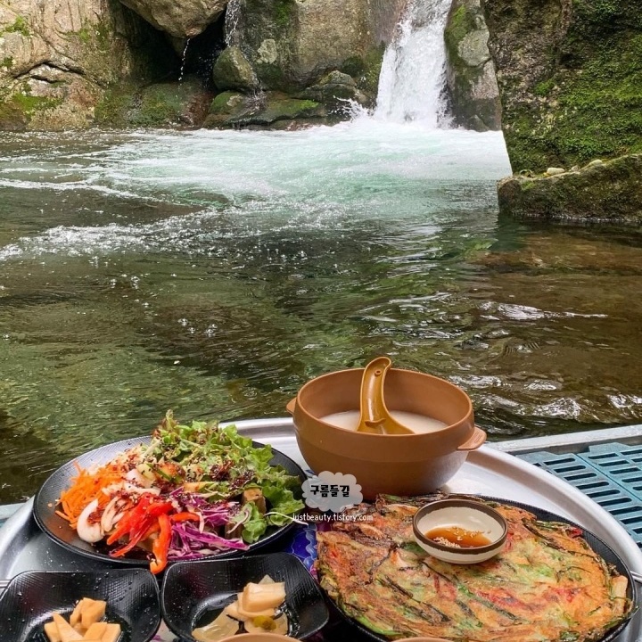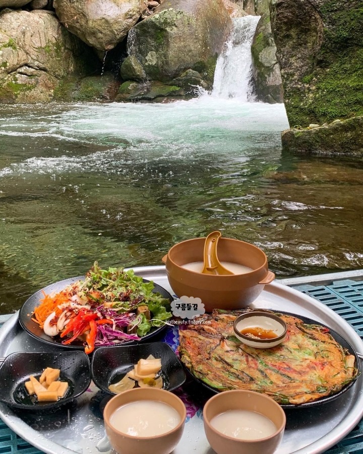 천천히 자연을 즐길수 있고 음식도 전반적으로 괜찮고 분위기가 넘 좋았습니다. 보기만 해도 시원한 계곡 물 위에서 얼음 동동 띄운 동동주랑 파전, 도토리묵까지 풀코스로 즐길 수 있는 식당으로 물에 발 담근 상태로 먹고 마시고 찐 행복이 아닐까 싶습니다. 여름 경남 하동 가볼만한곳 베스트 10으로 여름 휴가로도 좋겠습니다.