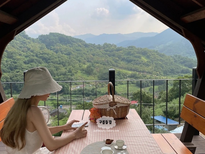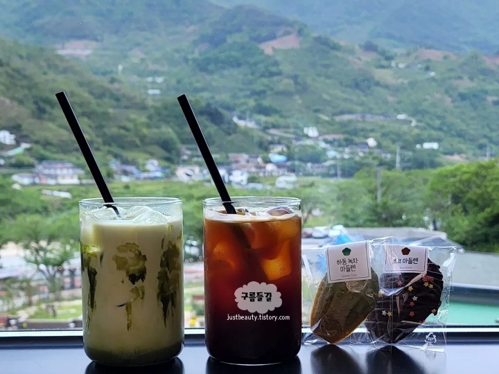 자연자연한 하동의 분위기에 어울리면서도 넓은 마당과 실내, 야외 좌석이 있는 곳으로 유리창에는 정금다원이 보이는 산뷰였고 저녁에도 예쁘답니다. 아무데서나 막 찍어도 너무 예쁜 풍경이라 힐링이었고, 크고 우거진 나무들도 많고 하동이 이렇게 예쁜 곳이라는 것을 보여주는 장소인 것 같습니다. 브로콜리처럼 촘촘한 산이 사방으로 둘러싸여 있고 넓은 정원에서 뛰놀 수 있는 곳, 더로드 101은 그야말로 알프스 하동을 보여주고 있었어요.