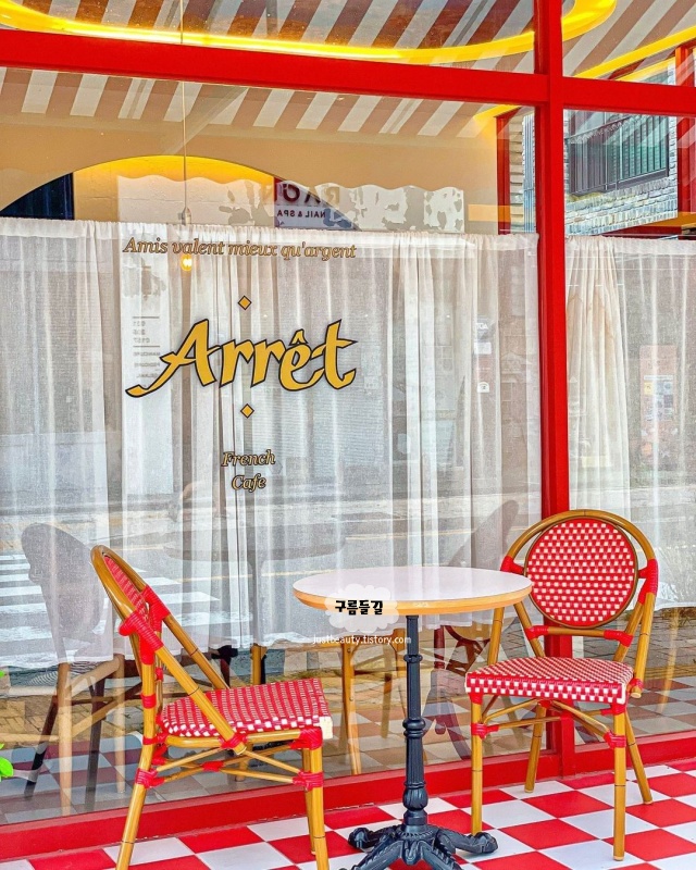 프랑스풍 프렌치 스타일 브런치카페 아레입니다. 넷플렉스에서 한창 핫했던 에밀리 파리에 가다 영화 속에 나오는 카페같은 분위기 가득했던 곳으로 멀리서 봐도 영롱한 빨간 리본 대문이 인상적이었습니다.