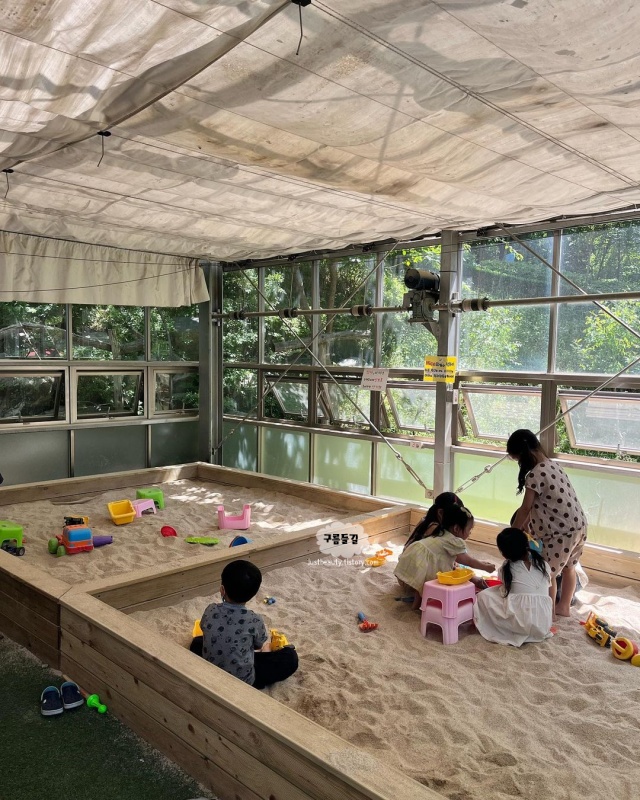 교외 분위기 물씬 나는 카페로 집라인 있는 야외 놀이터에, 실내 모래 놀이터, 오리, 공작새, 양, 닭 등이 있는 작은 동물원도 있습니다. 농구코트, 트램폴린, 시냇물에 올챙이까지 볼거리가 다양하더라구요. 교회에서 운영해서 그런지 메뉴들도 저렴하고 에버랜드보다 더 즐거운 건 그냥 기분탓일까요.