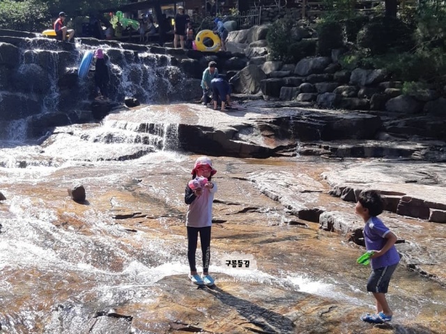 사람이 많아서 되도록 피하는데 그래서 좋아하는 곳이 과천 향교계곡입니다. 확실히 여기는 물이 많아서 튜브도 타고 놀 수 있는 점이 좋습니다. 튜브 타고 신난 아이들은 덜덜 떨면서도 안 나오는 곳이에요. 시원한 물놀이 하고 싶다면 과천향교 계곡으로!