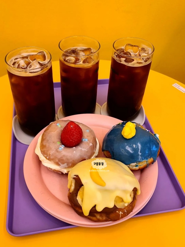매장 인테리어 색감도 너무 예쁘고 도넛이 많이 달지 않고 맛있었어요. 더운 여름날 걸어서 찾아가기에 조금 힘들긴 했지만 매장이 시원해서 너무 행복했어요! 저녁에 방문해서 디저트는 별로 안 남았으니 좀 빠르게 방문하는 게 좋습니다. 라즈베리 들어간 ns 모양 도넛이랑 망고크림 들어간 오리 도넛을 주문했는데 도넛이 정말 맛있어요!! 아아랑 같이 먹었는데 사르르 녹는 기분이어서 기분좋게 먹고 힐링할 수 있었습니다.