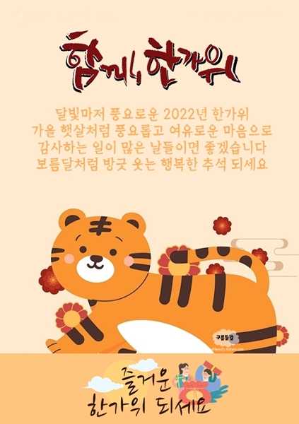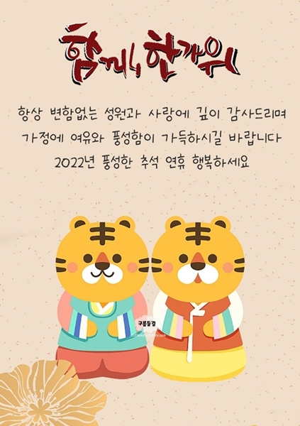 가정에 늘 웃음꽃과 화목함이 가득하길 기원합니다. 풍성하고 넉넉한면서 알찬 추석 명절 보내시고 아울러 가정의 건강과 행복을 기원합니다. 하루하루 웃음 가득하고 2022 남은 기간 하시는 일 모두 잘 되시기를 응원하겠습니다.