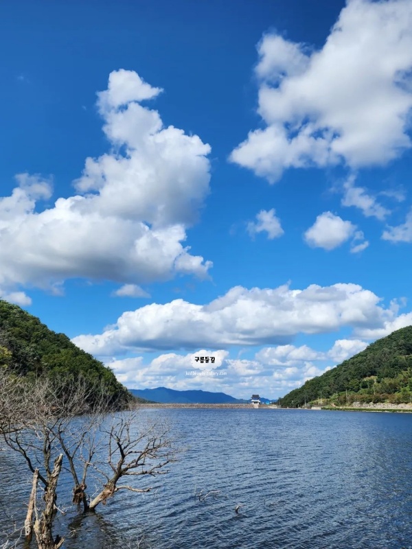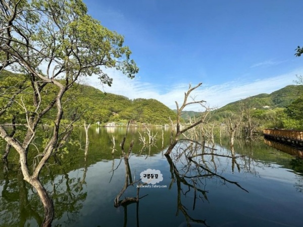 증평9경 중 하나인 삼기저수지는 물속에서 자라는 나무가 아주 인상적이었습니다. 증평 삼기저수지 습지생태공원 둘레길 등잔길 3km 트레킹은 가볍게 걷기도 좋았던 충청도 증평 가볼만한곳 베스트 10으로 경이로웠습니다. 삼기저수지 둘레길 3Km 정도라서 천천히 걸으면 40분이면 충분하고 여름에는 초록뷰, 가을에는 단풍이 물드는 산자락이 너무 아름답습니다.