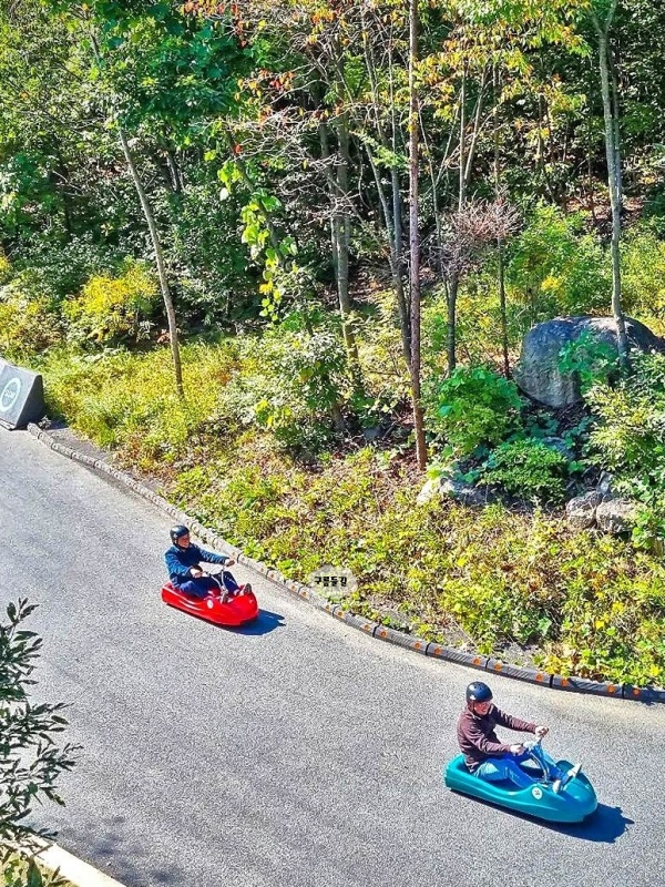 야외 이색 데이트와 나들이 코스로 딱 좋은 익스트림 루지입니다. 나무가 우거져 자연적으로 생긴 나무 터널도 지나갈 수 있는데 이런 이런 경험 아무 곳에서나 못합니다. 특히 익스트림 스포츠를 즐기고 싶었으나 겁이 많아 즐기지 못한 사람이더라도 단 10초 설명으로 운전대를 잡을 수 있을만큼 쉽습니다.