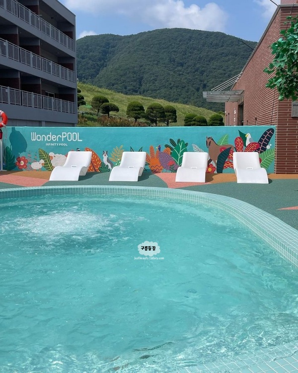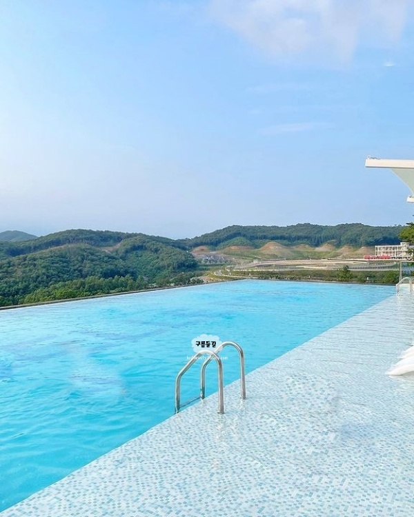 증평 이국적인 감성의 인피니티 풀입니다. 리버뷰+마운틴뷰까지 촤르르 펼쳐지는 분위기라서 해외여행 온 듯 이국적인 풍경에 두근거리는 충북 증평 가볼만한곳 베스트 10 장소였습니다.