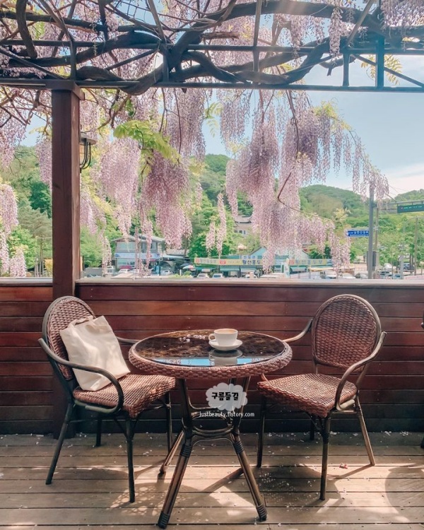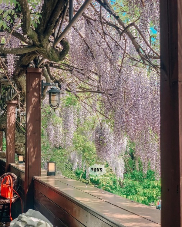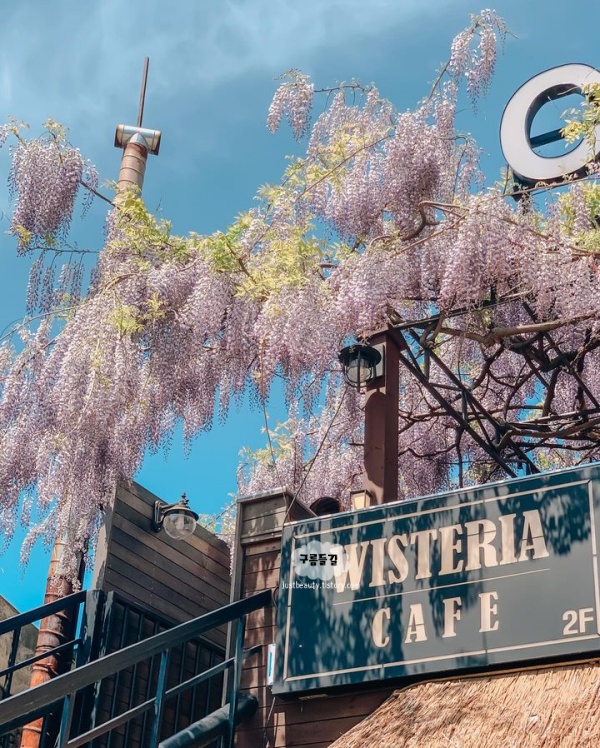 경기도 광주 남한산성 근처 카페 추천장소로 언제든 괜찮지만 이곳은 특히나 5월이 되기를 기다리게 만드는 카페 ‘위스테리아’입니다. 남한산성 한켠에 위치한 카페 위스테리아는 건물 2층에 위치한 곳으로, 야외 테라스 주변으로 아주 길고 풍성하게 등나무가 늘어져있어 몽환적입니다.