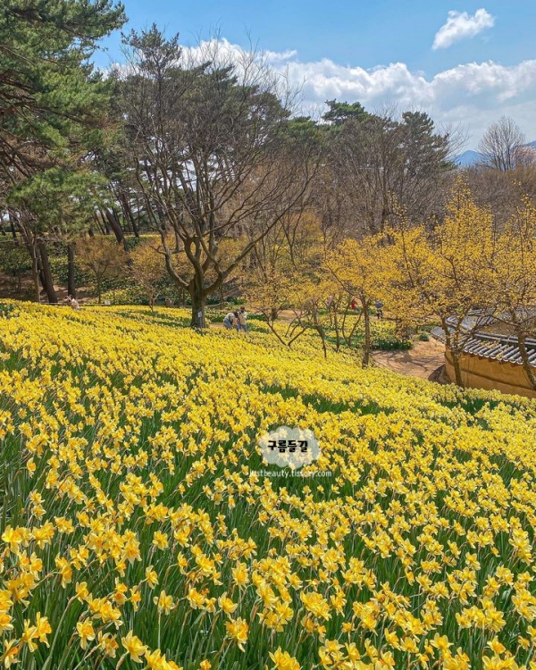 4월 국내여행하기 좋은곳 서산은 4월이면 노란 물결을 자랑합니다. 유기방가옥에는 수선화가 예쁘게 피어있고 봄에는 벚꽃이랑 튤립만 알았는데 수선화가 이렇게 예뻐도 되는 건가요? 노랑노랑 빽빽한 노랑 수선화 너무 예쁘고 봄기운이 가득합니다.
