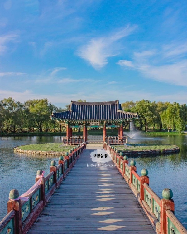 우리나라 최초의 인공연못 궁남지는 여름에 연꽃이 가득해서 더 예쁜 부여 가볼만한곳 베스트 10입니다. 거대한 연꽃 군락지가 있어서 연꽃시즌에 더 예쁘지고 연꽃이 없더라도 연못뷰가 참 청량합니다.