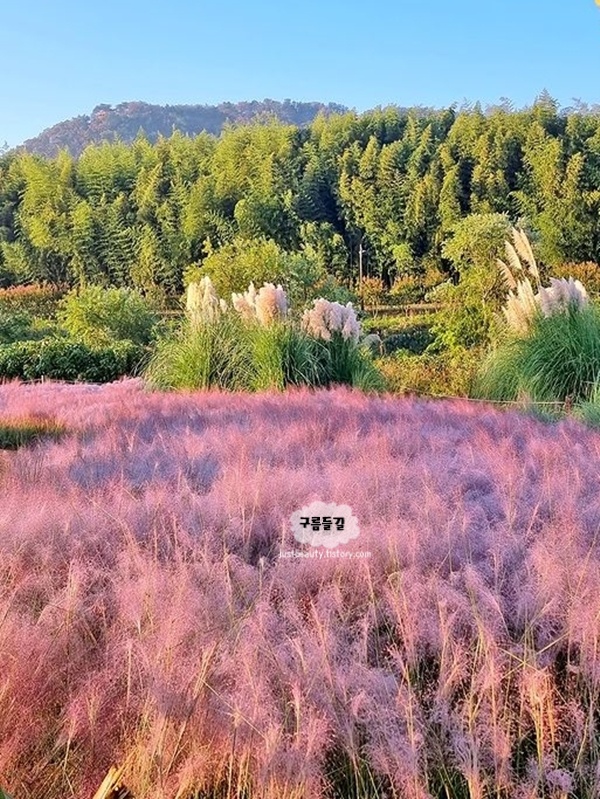 의령 호국의병의 숲은 국내 가을 여행지 베스트 50으로도 손꼽히는 곳입니다. 공원은 주차장이 있으며, 입장료는 무료입니다. 가을이면 핑크뮬리, 아스타국화, 코스모스 등 다양한 꽃들이 만개하여 가을을 물씬 느낄 수 있어요.