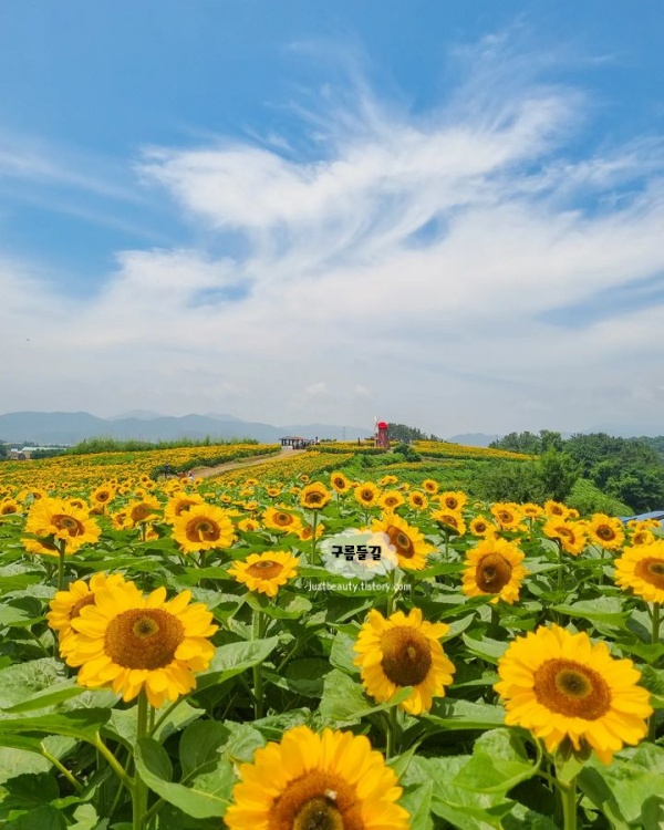 강주해바라기마을은 해바라기밭이 넓게 펼쳐져 있어 함안 여름 가볼만한곳 베스트 10 좋은 곳이었습니다. 이상기후로 인해 해바라기가 일찍 지면 축제는 종료되지만, 이후에도 꽃은 무료로 관람할 수 있습니다.