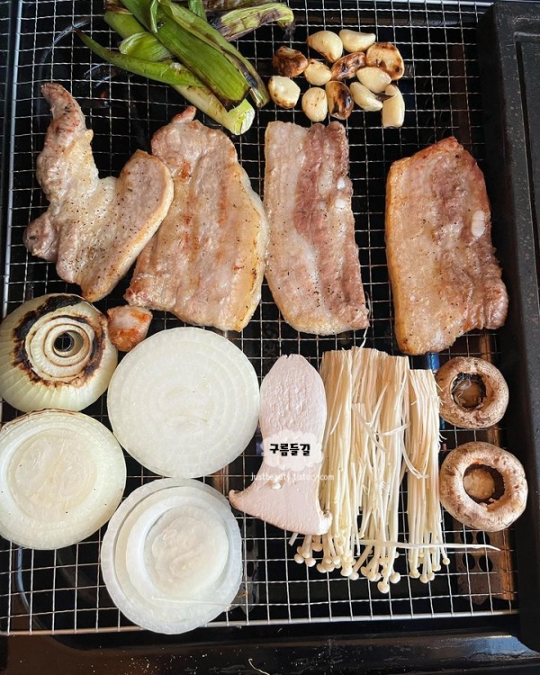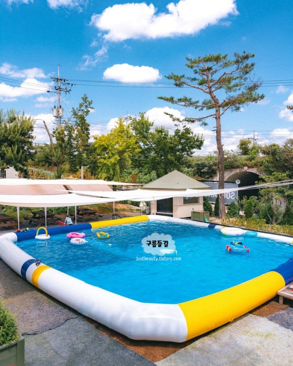고기는 하나씩 포장되어 깔끔하게 준비되어 있었고, 도마에 가지런히 담아주는 모습에서 세심한 배려가 느껴졌습니다. 직접 구워 한 점 먹어보니, 잡내 없이 신선한 고기 맛이 입안 가득 퍼졌습니다. 옆 테이블에서도 삼삼오오 모여 고기를 구우며 이야기꽃을 피우고 있었어요. 인공 계곡에서 발을 담그며 여유롭게 시간을 보내는 사람들도 보였고, 여름이면 아이들은 수영장에서 신나게 물놀이를 즐길 수 있습니다. 동남아 휴양지에 온 듯한 분위기 청주 아이와 함께 가볼만한곳 베스트 10이기도 해요.