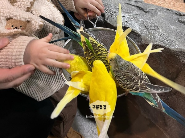 알록달록한 앵무새들이 활짝 펼친 날개를 펄럭이며 날아다니고 손에 먹이를 올려놓고 기다리자, 작은 새들이 머뭇거리다가 하나둘 내려앉았습니다. 아이들은 신기한 듯 눈을 반짝이며 손을 내밀었고, 새들이 조심스럽게 모이를 쪼아 먹는 순간, 그 작은 떨림마저도 신기해합니다.