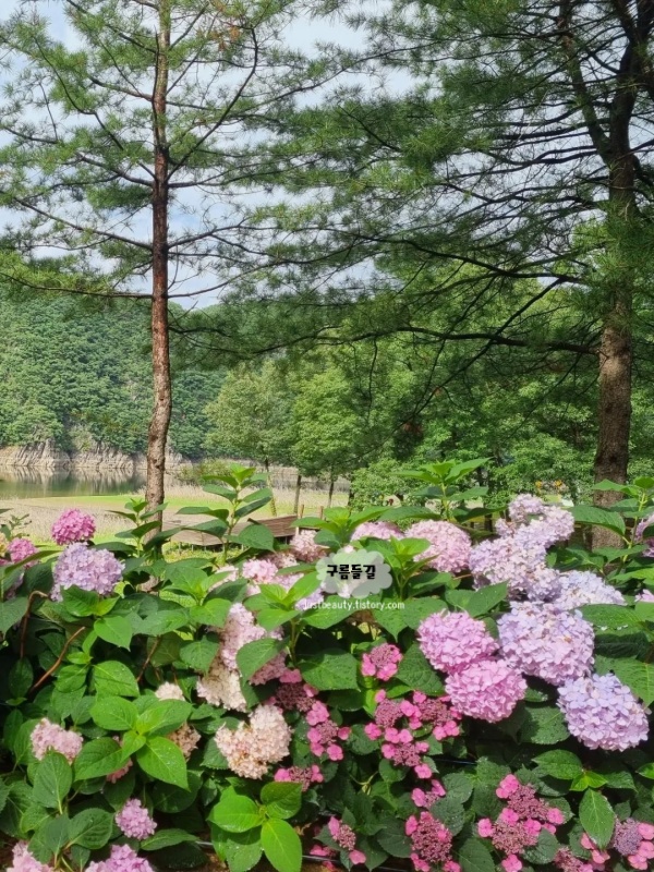 길은 어렵지 않고, 아이랑 함께 걸어도 무리가 없는 정도였고요. 물가 옆엔 평상이나 벤치도 놓여 있어서 햇빛 피해 앉아 쉬기에도 좋았습니다. 전체적으로 소란스럽지 않은 곳이라, 꽃을 구경하러 간다기보다 꽃에 둘러싸여 머무는 기분으로 가기 좋은 여름에 충북 가볼만한곳 베스트 10 장소였어요. 여름 한철, 수국 피는 시기에 그늘, 바람, 수국—세 가지가 다 맞는 날이면, 장계관광지는 충분히 여름에 가야 할 이유가 됩니다.