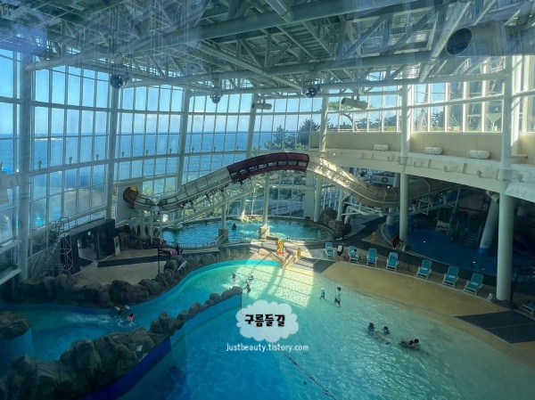 규모는 크지 않지만 아이들과 함께라면 오히려 한눈에 다 보여서 더 편했고, 찜질방이 있는 점이 워터파크 끝나고도 쉬기 좋아서 만족도가 높았어요. 편백나무방, 소금방, 황토방 등 다양했고 샴푸나 수건도 제공돼서 별도 준비 없이도 이용 가능했어요. 실내외가 연결된 구조라 갑자기 비가 오거나 햇빛이 강해도 부담 없이 이용할 수 있었고, 바다를 바라보며 즐기는 인피니티풀은 여행지의 여유를 만끽하게 해줬답니다.