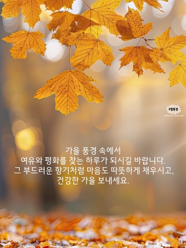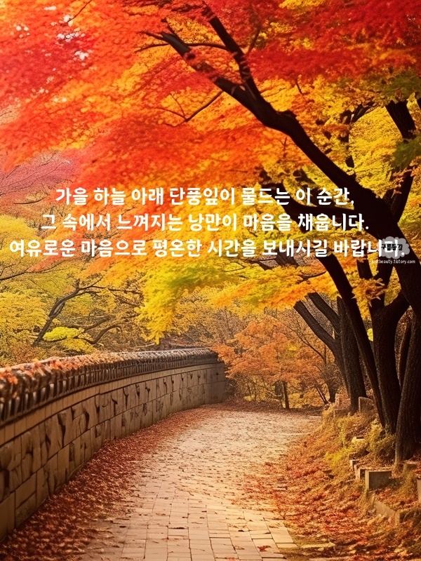 가을 단풍과 함께하는 하루도 좋겠죠? 가을바람에 춤추듯 흩날리는 단풍이 우리의 마음까지 물들입니다. 이 아름다운 계절, 단풍의 풍경을 감상하며 여유롭고 평온한 시간을 보내시길 바랍니다. 항상 행복과 건강이 함께하길 기원합니다.