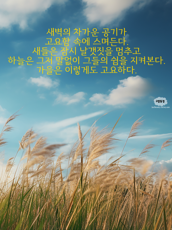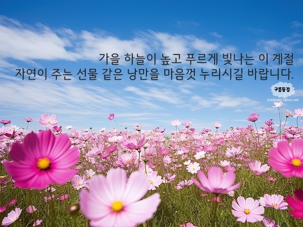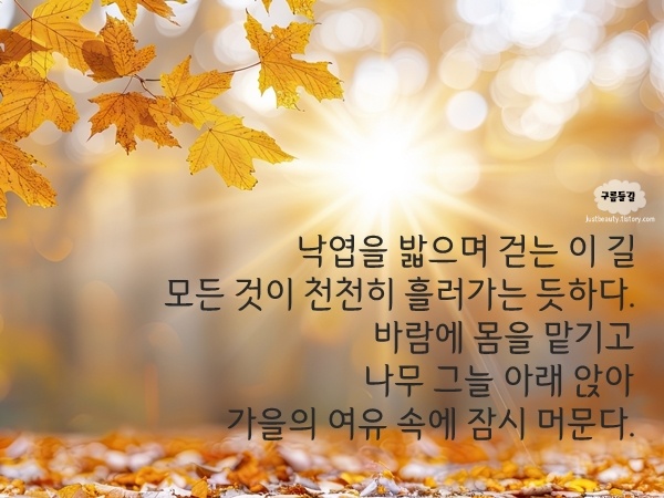 가을이 깊어지면서 낭만적인 풍경들이 펼쳐집니다. 그 속에서 느껴지는 여유와 따뜻함이 여러분의 하루를 더욱 특별하게 만들어주길 바랍니다. 건강하고 행복한 가을 보내세요.