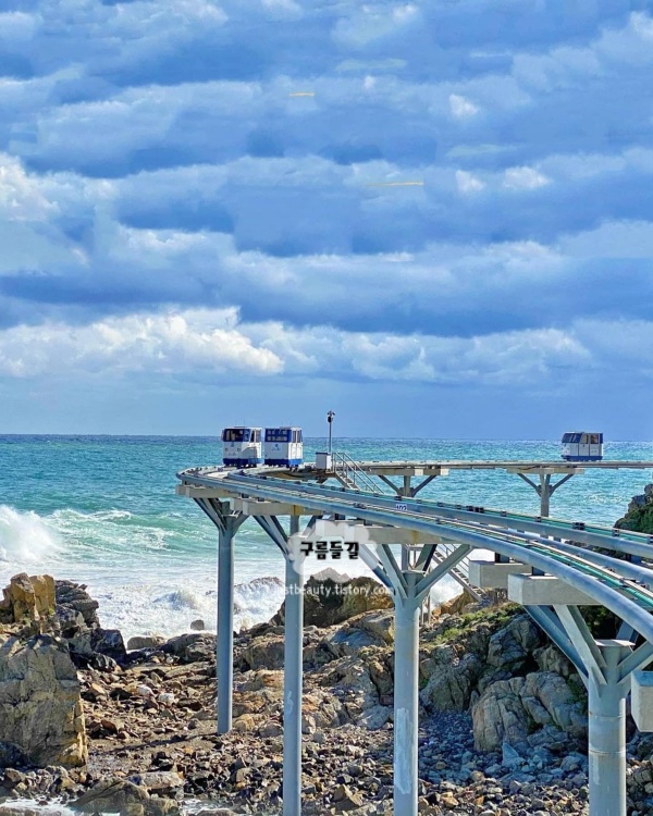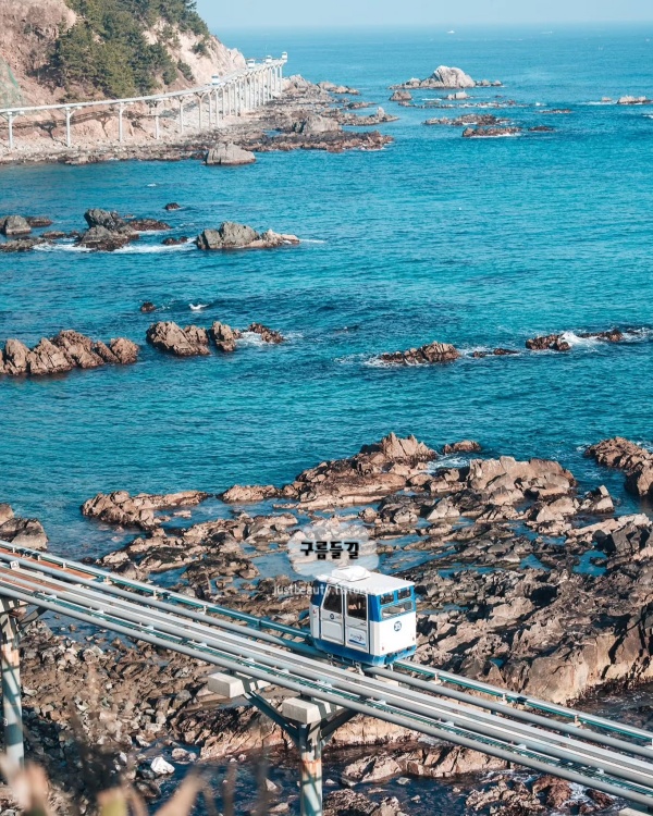 죽변항에서 봉수항까지 2.8km를 달리는 자동 모노레일로, 2021년 개장 이후 연간 34만 명이 찾는 울진의 랜드마크가 됐다. 시속 5km로 천천히 움직이는 덕분에 차창 너머 동해안이 파노라마처럼 펼쳐지고, 하트해변과 죽변등대가 눈앞으로 지나간다. 드라마 〈폭풍 속으로〉 세트장 바로 위를 지나는 구간에서 카메라를 들지 않을 수 없다. 해가 질 무렵 탑승하면 수평선이 주홍빛으로 물드는 장면이 40분 내내 이어진다.