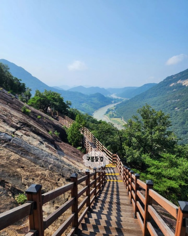 용이 거처하는 산이라는 뜻을 가진 용궐산은 거대한 암벽을 따라 지그재그로 설치된 잔도가 정말 압권이에요. 주차장에서 하늘길 정상까지는 약 1km 정도인데 가파른 계단이 꽤 있어서 왕복 1시간 반에서 2시간 정도 시간 여유를 두는 게 좋아요. 한 걸음 한 걸음 내디딜 때마다 시야가 넓어지며 나타나는 풍경은 그간의 고생을 싹 잊게 해줄 만큼 웅장하답니다.