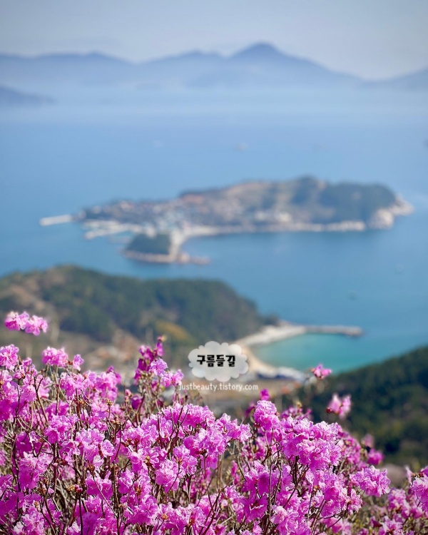해발 437m의 대금산은 낮은 산이지만 남해안 온난 기후 덕분에 전국에서 가장 일찍 진달래가 개화하는 산이다. 정상부에 진달래 군락이 3월 말~4월 초에 만개하는데, 정상에 서면 분홍빛 꽃물결 뒤로 거제 앞바다와 이수도, 맑은 날은 대마도까지 시야에 들어오는 구도가 이 산만의 것이다.