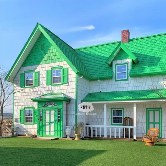 빨강머리앤의 집이 떠오르는 강원도 고성 카페로 빨강머리앤의 집에 놀러온 기분이 드는 강원도 고성 가볼만한곳 입니다. 동화속 한장면 같은 초록지붕 앤의집과 머리에 사랑스럽게 꽃을 꽂고 가서 기도했던 교회를 모티브로 한 고성의 한카페입니다. 정말 초록색 지붕에는 애니가 살고있는 것만 같아요!