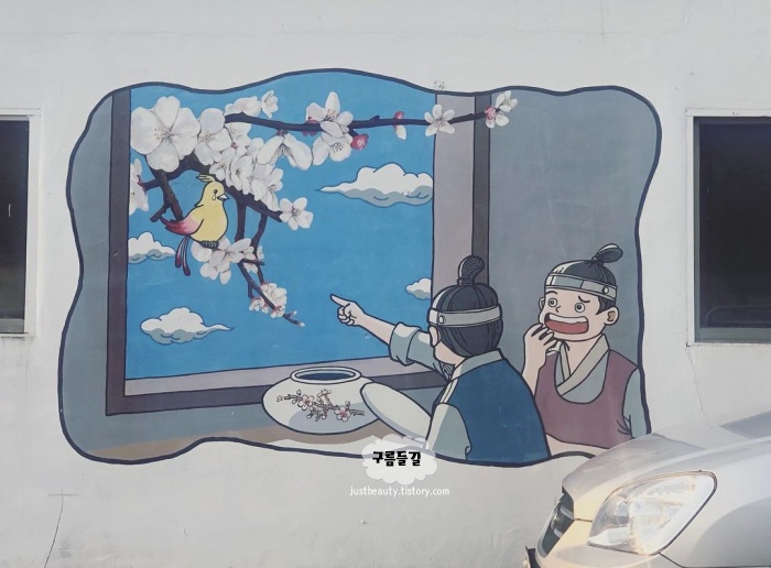 정겹고 귀여운 그림으로 가득해서 둘러보는 동안 흐뭇한 미소가 저절로 나와서 특히 부모님과 갈만한 곳으로 괜찮다는 생각이 들었습니다. 천천히 걸으며 그림을 보고 있으면 마치 어릴 적 읽던 동화 속에 빠진 것 같은 기분도 들었고 골목에 놓아둔 화분의 꽃과도 잘 어울렸습니다. 무엇보다 화전동 벽화 마을의 재미는 벽화향기 동화길의 숨은그림찾기에 있으니 놓치지 말아야할 포인트입니다. 마을 꼭대기에서는 마을의 전경을 한눈에 볼 수 있으니 이곳도 꼭 둘러보시길 바랍니다.