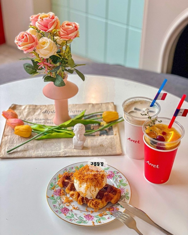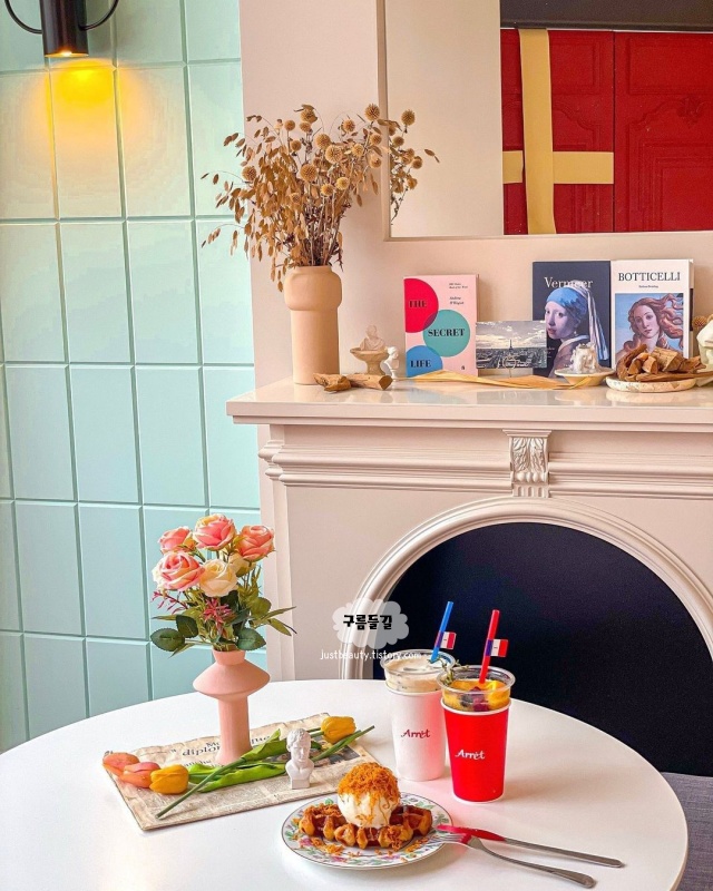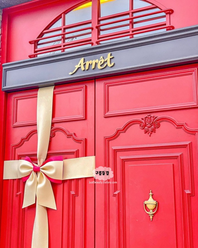 프랑스풍 프렌치 스타일 브런치카페 아레입니다. 넷플렉스에서 한창 핫했던 에밀리 파리에 가다 영화 속에 나오는 카페같은 분위기 가득했던 곳으로 멀리서 봐도 영롱한 빨간 리본 대문이 인상적이었습니다.