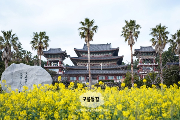 절 입구부터 유채꽃과 벚꽃이 함께 피어나는 특별한 곳이에요. 노란 유채꽃과 연분홍 벚꽃이 어우러진 풍경이 정말 아름답답니다. 절 자체도 고즈넉하고 평화로워 산책하기 좋아요. 입장료는 무료예요.